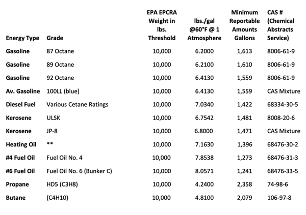 The following gallons-to-pounds conversion chart below can be used to determine the 10,000-pound reporting trigger applicable to storage facilities other than retail gasoline and diesel fuel stations: